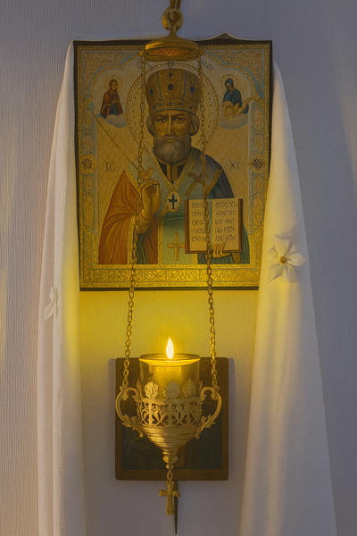 Pyhä Nikolai Ihmeidentekijän ikoni ja lampukka (kuva © Hannu Pyykkönen/ON)